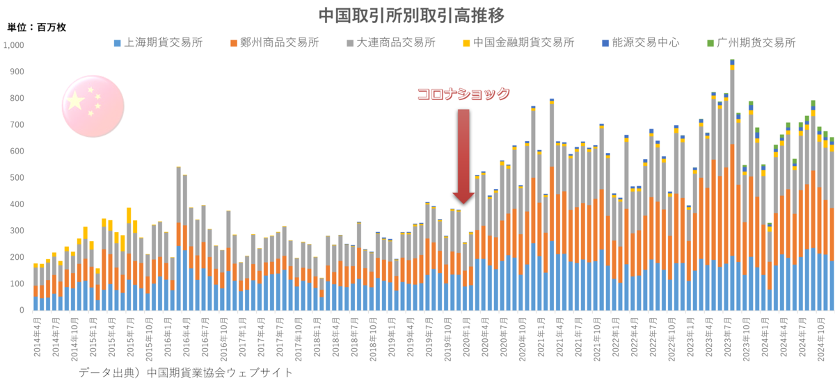 <グラフ:中国6大先物取引所のデリバティブ取引高推移(~2024年12月)>