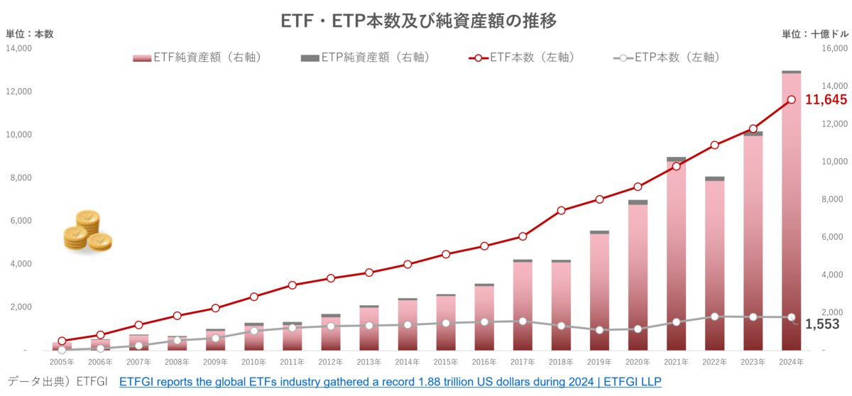 出典)ETFGIウェブサイトに掲載されたデータをもとに、筆者にて作成・一部加工。なお、ETP(Exchange Traded Product)はETF(Exchange Traded Fund;上場投資信託)に、ETN(Exchange Traded Note)やETC(Exchange Traded Commodity)、ETV(Exchange Traded Vehicle)等の亜流を加えた総称。ETFよりも概念が広い。